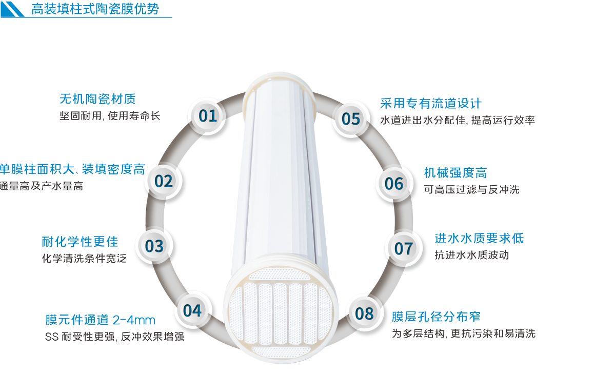 久吾高(gao)裝填柱(zhu)(zhu)式陶(tao)(tao)瓷(ci)膜(mo)(mo)(mo)是在(zai)久吾傳統管式陶(tao)(tao)瓷(ci)膜(mo)(mo)(mo)及平板(ban)式陶(tao)(tao)瓷(ci)膜(mo)(mo)(mo)技(ji)術基(ji)礎上(shang)研制出的(de)(de)一款(kuan)用于水處(chu)(chu)理的(de)(de)無機超濾膜(mo)(mo)(mo)。高(gao)裝填柱(zhu)(zhu)式陶(tao)(tao)瓷(ci)膜(mo)(mo)(mo)是采(cai)用高(gao)強(qiang)度α-Al2O3在(zai)高(gao)溫(wen)下焙燒(shao)制成,擁有(you)良好的(de)(de)耐高(gao)溫(wen)性能,抗(kang)化學腐蝕性,優秀的(de)(de)機械(xie)強(qiang)度。相對傳統多通(tong)道(dao)管式陶(tao)(tao)瓷(ci)膜(mo)(mo)(mo),高(gao)裝填柱(zhu)(zhu)式陶(tao)(tao)瓷(ci)膜(mo)(mo)(mo)單(dan)支膜(mo)(mo)(mo)管過(guo)濾面積可達(da) 10-25 ㎡,擁有(you)更大(da)的(de)(de)裝填密度及處(chu)(chu)理能力,能夠(gou)有(you)效去(qu)除(chu)固體(ti)懸浮物、細菌(jun)以及膠體(ti)等(deng)物質,可應用于民用安全用水、市(shi)政(zheng)給水和廢(fei)水處(chu)(chu)理、應急供(gong)水、水回用、工(gong)業過(guo)程廢(fei)水等(deng)多個領域。